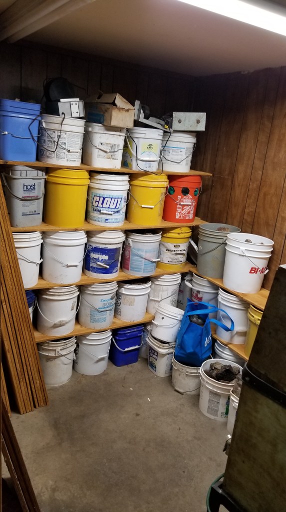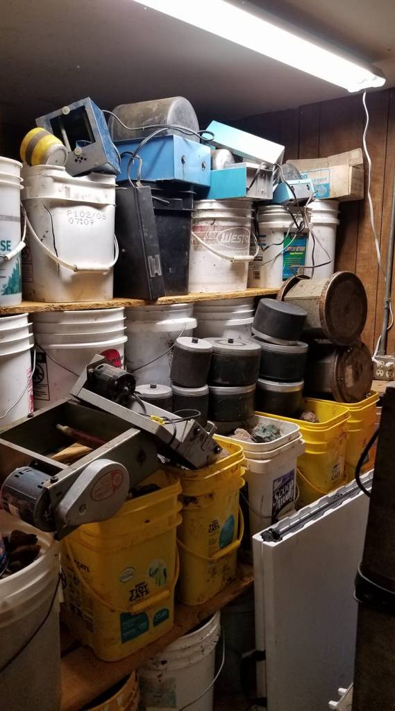 He was cool with that plan. So we moved over 200 buckets of rough rock along with several large pieces of lapidary equipment into this tiny storage room. There was not much walking space to the light switch when we got done!